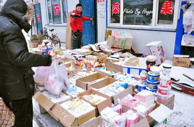 當(dāng)然漠河那么冷,很多東西是不用放在室內(nèi)賣(mài)的,比如冰棍、雞鴨魚(yú)肉、還有部分水果,天然的冰箱。