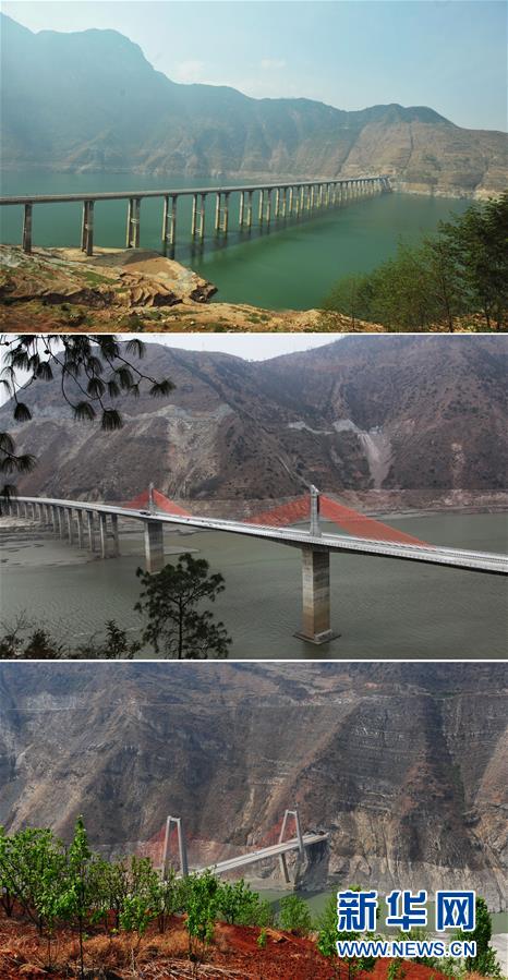 雅西高速瀑布溝庫區(qū)路段3座跨大渡河特大橋:青杠嘴特大橋(上圖)、觀音巖特大橋(中圖)、蘇村壩特大橋(下圖,拼版照片,攝于2012年4月12日)。1935年5月24日、25日間,紅軍“十七勇士”在槍林彈雨中,以一條木船強行從安順場渡河,在國民黨軍視為天險的大渡河防線上,撕開了一個缺口,為紅軍沿大渡河兩岸夾河北上奪占瀘定橋創(chuàng)造了有利條件。 “紅軍不怕遠征難,萬水千山只等閑?!遍L征譜寫了一曲人類征服自然的凱歌,峽谷激流、雪山草地、物資匱乏、生命禁區(qū),這一切都不能阻擋紅軍前進的步伐。80年過去,滄海桑田,紅軍長征走過的荒郊野嶺,如今樓宇林立,欣欣向榮;徒步翻越的大山、攻克的關隘、沼澤遍布的草地、泅渡的河流,修起了通暢快捷的公路和大橋……長征之路發(fā)生了翻天覆地的變化,昔日的艱難險阻正漸漸變成康莊通途。新華社記者江宏景攝
