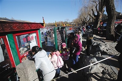 2月1日,北海冰場(chǎng)迎來(lái)客流高峰,售票處排起長(zhǎng)隊(duì)。新京報(bào)記者 王飛 攝