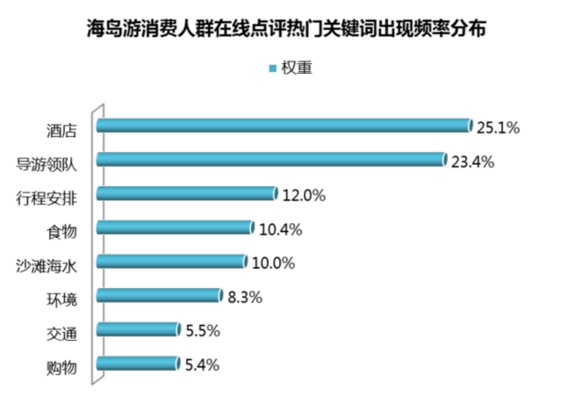 《報告》基于同程旅游海島游用戶在線點評數(shù)據(jù)的分析顯示,“住”是海島游消費人群最為關注的一個消費元素,其次是人員服務(尤其是導游領隊),與游客全程接觸的導游領隊的服務態(tài)度、專業(yè)度等也非常受關注,甚至成為影響游客最終評價的關鍵因素。相比之下,購物的關注度相對較低,這與普通的旅游線路存在較大差別。此外,沙灘、海水等與海島相關的風景元素受關注程度較高,不少游客在點評中用較大篇幅描述沙灘、海水等風景元素。