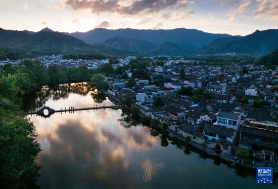 夏日傍晚時分,在擁有900多年歷史的中國傳統(tǒng)古村落、位于安徽省黃山市黟縣的宏村,湖面倒映著晚霞,游人在橋間駐足流連,享受季夏夜晚時光。