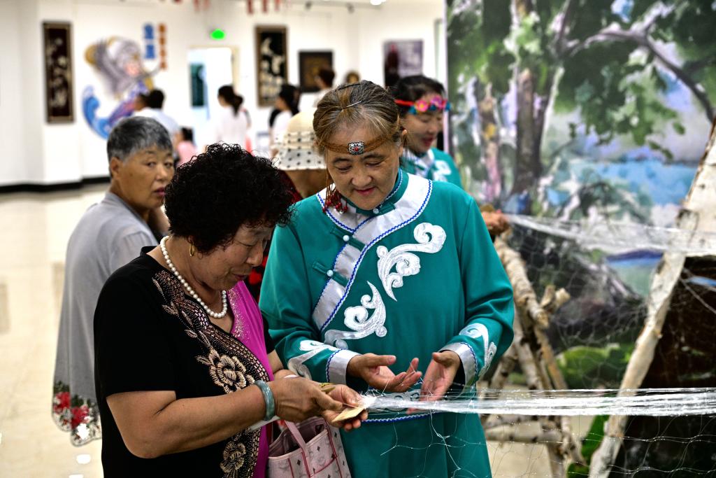 同江市非物質(zhì)文化遺產(chǎn)展示館內(nèi),身穿民族服飾的赫哲族居民向游客介紹赫哲族傳統(tǒng)技藝。新華社記者 丁赫 攝