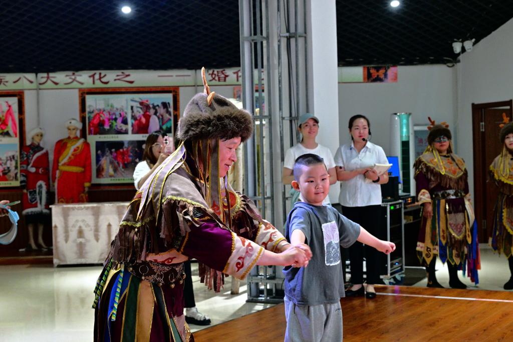 在展示館二樓活態(tài)展示區(qū),赫哲族演員頭戴鹿角帽,身穿民族服裝,跳起熱烈的“溫吉尼”舞蹈,為前來參觀的游客帶來一場神秘又震撼的視聽盛宴。表演結(jié)束后,游客還可以走上舞臺,和演員們學(xué)習(xí)薩滿舞的舞蹈動作,體驗赫哲族古老的文化。