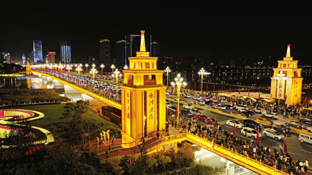 夜幕下新近改造的迎澤大橋宛如一條被紅色點亮的巨龍,橫臥在波光粼粼的汾河之上。金色的欄桿、飄動的五星紅旗、耀眼的中華燈裝扮出濃濃的節(jié)日氛圍,從四面八方趕來的人們漫步橋上,頻頻舉起手機(jī)拍照留念。