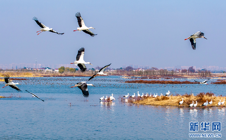 12月19日,安徽省合肥市廬江縣黃陂湖濕地,國(guó)家一級(jí)保護(hù)動(dòng)物東方白鸛在此嬉戲、覓食,自由飛翔。