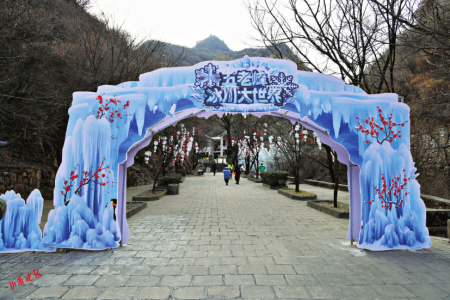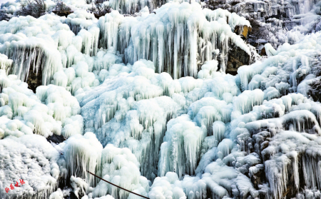 五老峰景區(qū)錦繡谷,工作人員借助天然溪流形成的冰掛加以人工造冰造型,按照生態(tài)環(huán)保和藝術(shù)創(chuàng)意要求,打造出長(zhǎng)約1公里、單體高3米至10米的彩色冰掛,極具視覺(jué)沖擊力。一條條冰掛或垂于崖壁,或懸于樹(shù)枝,晶瑩剔透,壯觀雄渾。滿目的玉樹(shù)瓊花、銀峰玉柱形成一幅霧凇冰掛奇景,讓人仿佛置身于童話世界。
