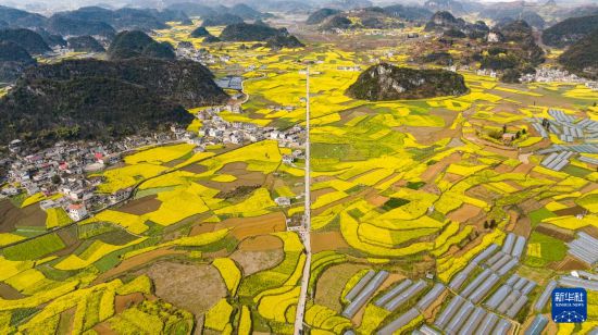 近日,貴州省六盤(pán)水市六枝特區(qū)木崗鎮(zhèn)的15000余畝油菜花競(jìng)相綻放。金黃的油菜花同田地、道路、民居構(gòu)成一幅幅美麗的春日畫(huà)卷。