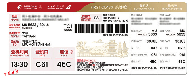 此次升級不僅注重文化表達,更著力提升服務(wù)體驗。登機牌對登機口、起飛時間、座位號等關(guān)鍵信息進行了“放大提亮”處理,通過字體加粗、色彩對比等設(shè)計,顯著提升了信息辨識度,特別方便老年旅客快速獲取信息,有效降低誤機風險,體現(xiàn)了東航精細化服務(wù)理念。