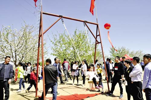 4月23日,為了進一步鞏固脫貧成效,提升鄉(xiāng)村旅游品牌效應(yīng),展示當?shù)靥厣r(nóng)產(chǎn)品和黃土高原的風土人情,保德縣楊家灣鎮(zhèn)段家溝村隆重舉辦了首屆美麗鄉(xiāng)村賞花攝影節(jié)。圖為前來賞花的游客正在蕩秋千。(劉澤宇 攝)