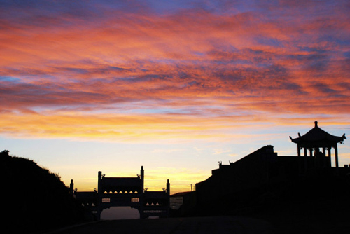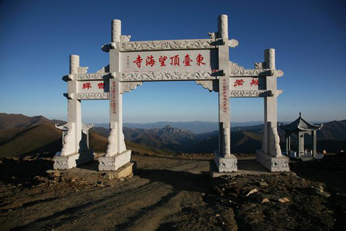 望海峰的盛景在于東觀日出。由于東面再無大山阻擋,所以人的目力可東眺非常遙遠(yuǎn)的地方。峰頂曾建有望海樓,專門為觀景而建??上昃靡褮В?985年重建,為望海寺,內(nèi)供聰明文殊。有史籍記載日出之壯麗景象:“每當(dāng)蒸云寢壑之隙,爽氣澄秋之際,于日出扶桑之時,可望紅日十倍于車輪,紅輪之下,隱隱水光閃爍,若波若鏡,瑰麗非凡。1977年8月,趙樸初先生登東臺觀日出后乘興填詞《五臺雜詠·調(diào)寄憶江南》,形象描繪了東臺日出之勝景: