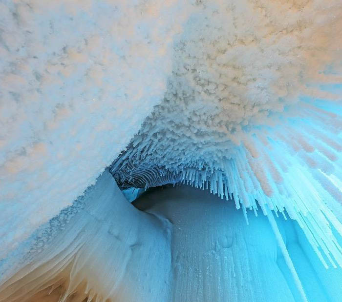 第二天一早,閆鵬和他的朋友全副武裝再次來(lái)到了這里,決心對(duì)這個(gè)洞探個(gè)究竟。他們拉了一條繩子進(jìn)入洞中,里面黑咕隆咚,腳底滑得根本沒(méi)有腳蹬的地方。后來(lái)到了一個(gè)稍微開(kāi)闊的地方,站穩(wěn)腳之后,拿火把四周一看,眼前豁然開(kāi)朗。他們仿佛置身于一座晶瑩的宮殿,四處都是冰的世界:冰柱、冰錐、冰瀑、冰筍、冰花。