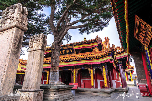 全寺占地四十五畝,順山就勢(shì)而筑殿宇,布局嚴(yán)謹(jǐn)。寺前有石階一百零八級(jí)。山門內(nèi)有天王殿、鐘鼓樓、大雄寶殿等建筑。各殿均用三彩琉璃瓦覆蓋。又,寺內(nèi)有康熙御碑,方座螭首,矗立在前院;乾隆御碑在東禪院碑亭內(nèi),以方形巨石雕成,高六公尺,每面寬一公尺,上刻漢、滿、蒙、藏四種文字。