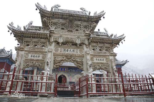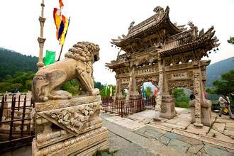 影壁中間鑲嵌有一石雕刻,文殊騎獅居中,人物花卉滿布四周,構(gòu)圖嚴謹,神情逼真。向北登108級臺階即達山門,門前漢白玉石獅一對,勾欄小拱橋一座,石牌坊一座,旗桿高聳于兩側(cè),雕工均佳。其中石牌坊最引人神往,從基石,抱柱,斜戧,額枋,斗拱到瓦頂,脊獸,無一不是精雕細刻,人獸,花卉,流云,山水等分布殿內(nèi),玲瓏剔透,它共有三門六柱,呈“一”字形,整體雄偉壯觀,巧奪天工,據(jù)說是由工匠耗時六年才建成。牌坊上刻有89條蛟龍,鱗爪俱現(xiàn),神態(tài)逼真;人物表情栩栩如生。游人觀后,無不交口稱贊,印象深刻。寺內(nèi)三座院落橫向排列,相互串通,又各有山門,自成風格。東院為殿院,依地勢分前后兩進,除山門外,中線上還有佛殿兩座,圍枝廂房配殿,塑像俱存,彩繪房和獻亭,曲廊環(huán)繞,雙塔高聳,其中普濟禪師塔雕尤為精致。距龍泉寺西北里許的山坡,有一座楊業(yè)的瘞骨塔,六角、三級,高約10米。傳說楊業(yè)死后,五郎將其尸骨葬此,并建塔紀念。宋太宗后來追封楊業(yè)為楊令公,故后人稱此塔為令公塔。