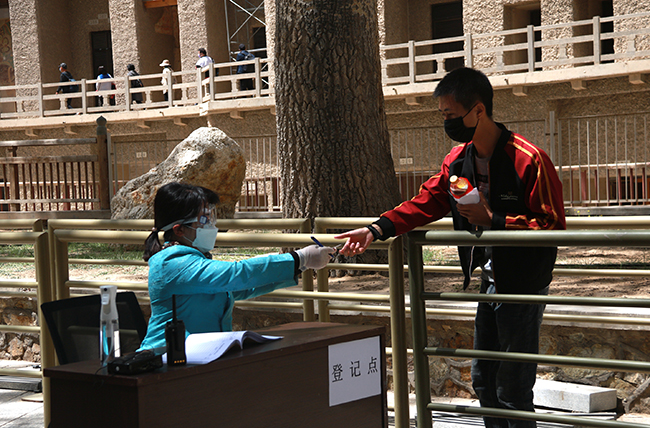 10日上午9點,在敦煌莫高窟數(shù)字展示中心門票業(yè)務辦理處,幾十名游客正在“1.5米線”排隊等候測溫登記,在通向窟區(qū)的擺渡車上,游客按照間隔就座。游客申領國家或者甘肅省的“健康碼”后,可預約購買10日內的門票。