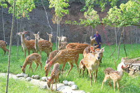 基地采用“公司+基地+合作社+農(nóng)戶”的經(jīng)營模式,鼓勵和扶持農(nóng)戶認(rèn)養(yǎng)梅花鹿和種植農(nóng)作物,并以訂單式回收,確保農(nóng)戶收益。上桑林村村民劉海軍四年前認(rèn)養(yǎng)了兩頭鹿,每年每頭鹿凈增收4000多元?!拔艺J(rèn)養(yǎng)的是公鹿,村里認(rèn)養(yǎng)母鹿的收入更多,畢竟生下的小鹿都是個人的。還有在基地上班的也不少掙?!?/p>