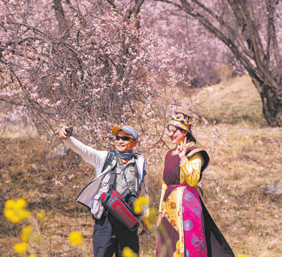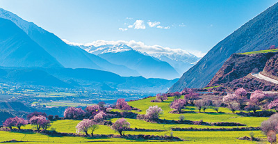 盛開的桃花與遠處的雪山相映成景。