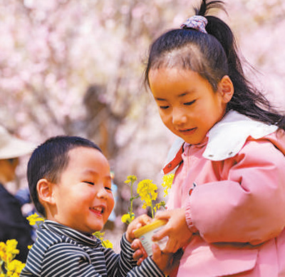 小朋友在桃樹下開心玩耍。