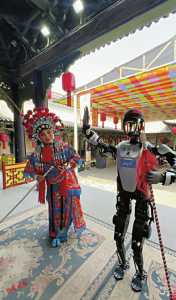 “山河+”人形機器人記者還與祁縣非遺傳承人上演了一場祁太秧歌,為游客助興。