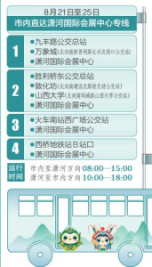 太原市將在山西文博會期間開通5條免費公交接駁專線。其中,4條市內直達瀟河國際會展中心的專線,分別從九豐路公交總站—萬象城(北向南新晉祠路長興北街口公交站)—瀟河國際會展中心;勝利橋東公交總站—敦化坊(北向南建設北路敦化坊公交站)—山西大學(北向南塢城路山西大學公交站)—瀟河國際會展中心;火車南站西廣場公交站—瀟河國際會展中心;西橋地鐵站B站口—瀟河國際會展中心。運行時間為市內至瀟河方向8:00—15:00,瀟河至市內方向10:00—18:00。此外,為便于駕車自行前往的市民出行,還開通了1條社會停車場至山西瀟河國際會展中心的免費接駁線路。該線路從先行路瀟河大街口經先行路至會展中心往返運行,在智慧南街口、先行路樂商街口???,運行時間為9:00—18:00。