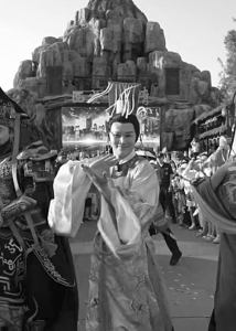 49歲的知名演員鄭國霖身著明黃龍袍、金冠束發(fā)、嘴叼玫瑰,騎著摩托車載著另一位扮演“秦始皇”的演員呼嘯而過。兩位“千古一帝”的魔性互動引得現(xiàn)場游客陣陣歡呼。這并非影視劇拍攝現(xiàn)場,而是上海千古情景區(qū)的日常一景。