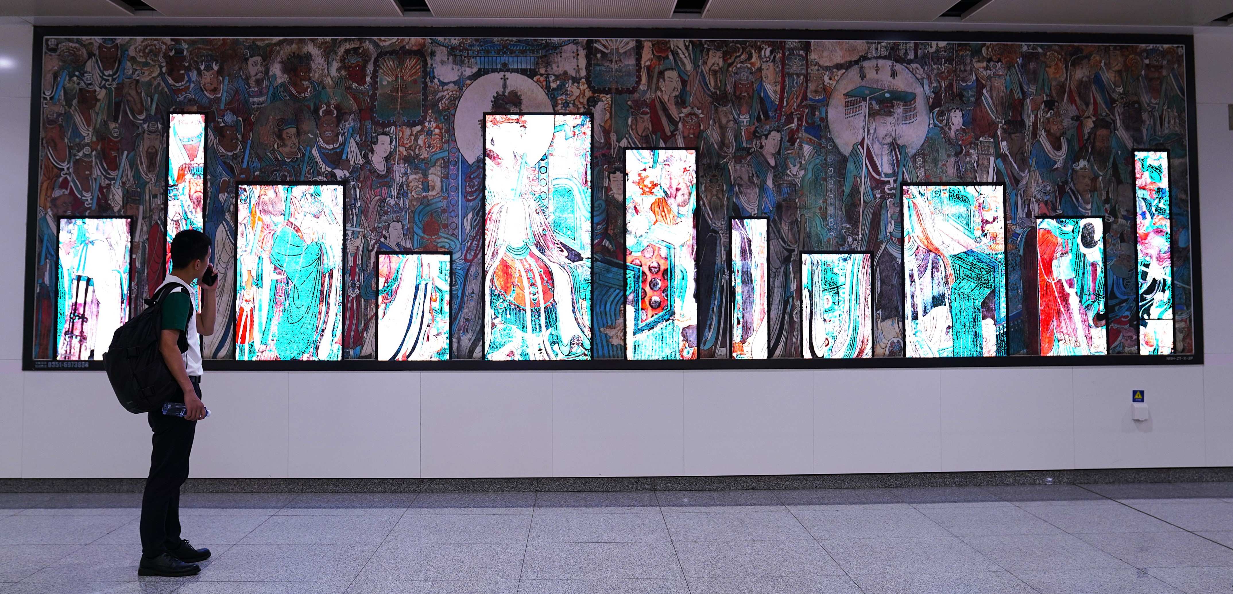 連永樂宮壁畫的絢麗、云岡石窟大佛的莊嚴、應(yīng)縣木塔的精巧,都被藝術(shù)復刻在站廳里——等車的間隙,有人會盯著壁畫上的飛天出神,有人會摸著梁思成筆下的古塔紋路發(fā)呆,匆忙的通勤路,忽然就多了份文化的滋養(yǎng)。