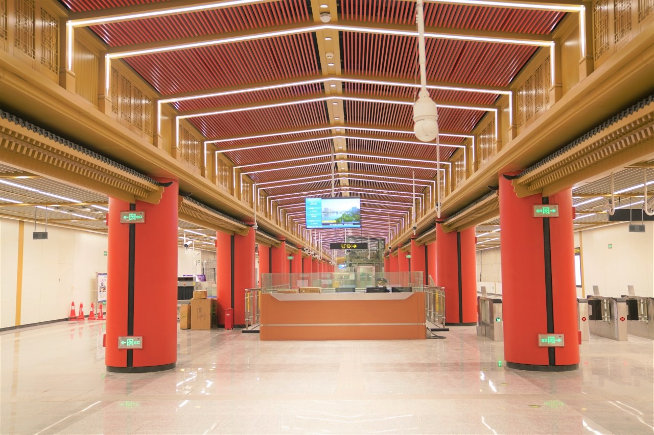 長風街站則以《西廂記》為靈感,提取中式園林月亮門元素,既展現(xiàn)出劇里的浪漫,又裹著中式園林的柔,營造出“比翼雙飛”的浪漫氛圍。