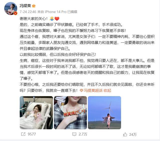 前不久,歌手馮提莫在微博發(fā)文稱自己患甲狀腺癌,經(jīng)手術(shù)已恢復(fù)。她說,通過這個(gè)癌,想對(duì)大家說,尤其是女孩子們,一定不要精神內(nèi)耗,不要往心里積壓負(fù)能量。