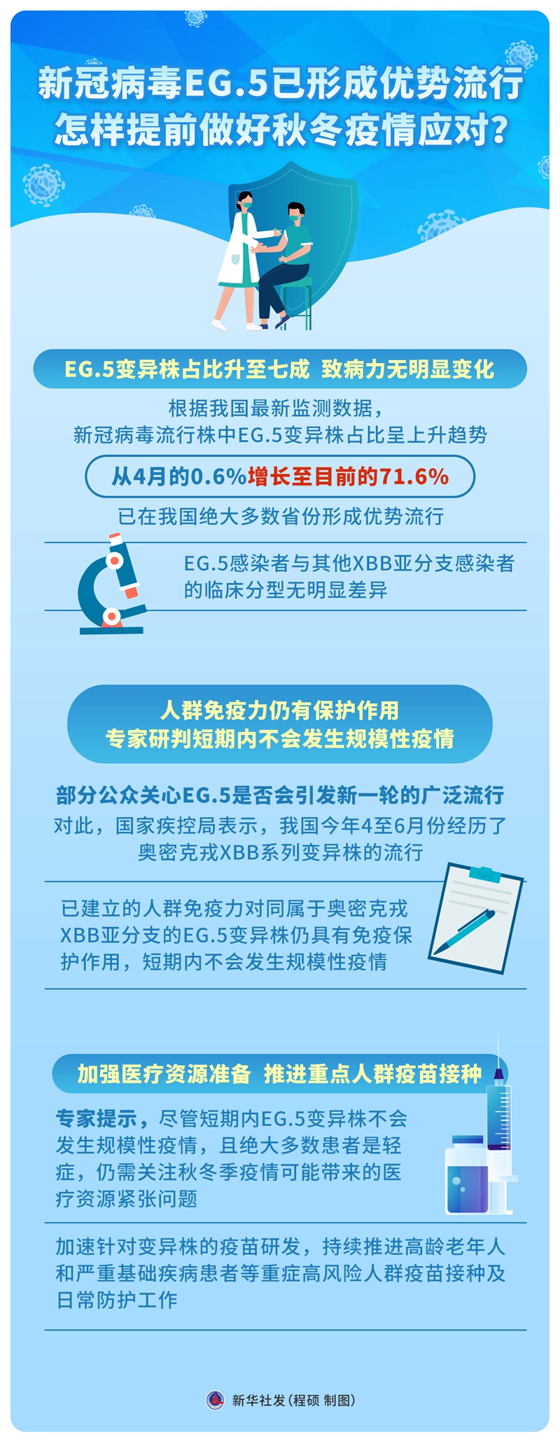 專家提示,盡管短期內(nèi)EG.5變異株不會(huì)發(fā)生規(guī)模性疫情,且絕大多數(shù)患者是輕癥,仍需關(guān)注秋冬季疫情可能帶來的醫(yī)療資源緊張問題,加速針對(duì)變異株的疫苗研發(fā),持續(xù)推進(jìn)高齡老年人和嚴(yán)重基礎(chǔ)疾病患者等重癥高風(fēng)險(xiǎn)人群疫苗接種及日常防護(hù)工作。