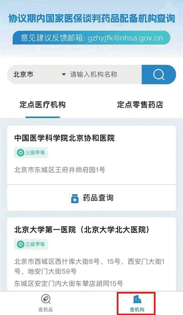 第三步:點擊“定點醫(yī)療機構”或“定點零售藥店”,即可查詢該藥品在各地區(qū)的配備情況。同時,您也可以點擊頁面下方“查機構”,進入“定點醫(yī)療機構”或“定點零售藥店”頁面,確定具體的醫(yī)療機構或零售藥店后,點擊“藥品查詢”,了解該機構配備的全部“國談藥”情況。