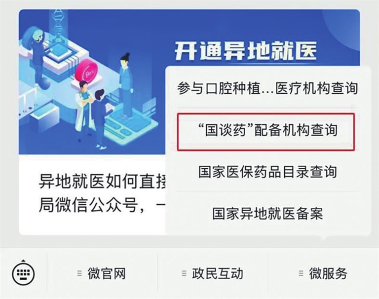 第一步:進入“國家醫(yī)保局”微信公眾號,點擊微服務→“國談藥”配備機構查詢,進入查詢頁面。