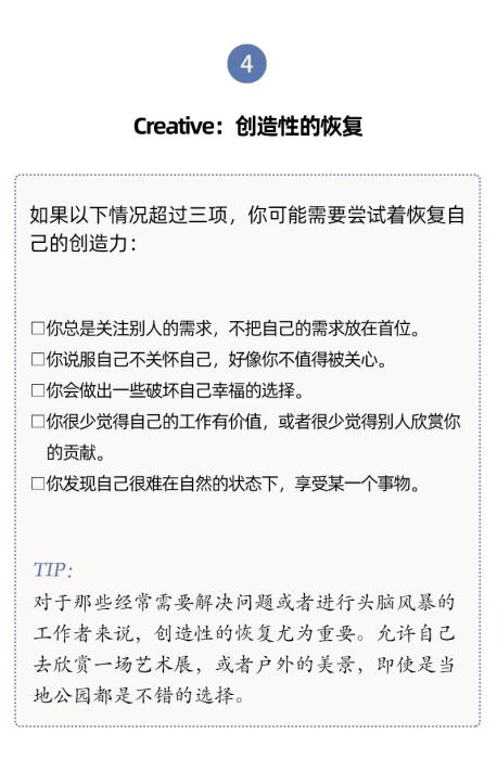 真正的休息,能夠幫助你從受外部刺激影響轉(zhuǎn)向調(diào)整自己的身體、思想和感受。當(dāng)你選擇了適合自己的休息方式,集中注意力,就會(huì)和自己聯(lián)系起來(lái),回到當(dāng)下。