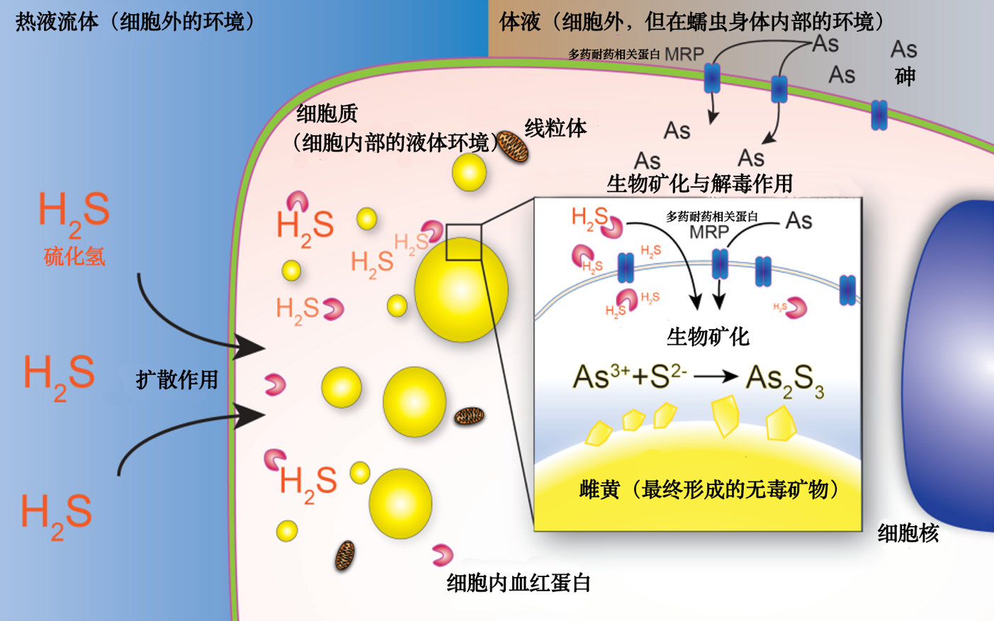 2025年8月,中國科學(xué)院海洋研究所的研究團(tuán)隊在《PLOS生物學(xué)》(PLOS Biology)上發(fā)表了一項驚人發(fā)現(xiàn):赫斯帕拉爾文氏蠕蟲通過一種前所未有的“以毒攻毒”機(jī)制,將兩種致命毒素——砷和硫化氫——結(jié)合成無毒的雌黃礦物,實現(xiàn)了生物界首個已知的解毒性生物礦化。