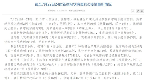 人民網(wǎng)北京7月23日電(董童)國家衛(wèi)生健康委于今日在官網(wǎng)發(fā)布的《截至7月22日24時新型冠狀病毒肺炎疫情最新情況》(以下簡稱“情況”)提出,7月22日0—24時,31個?。ㄗ灾螀^(qū)、直轄市)和新疆生產(chǎn)建設(shè)兵團報告新增確診病例22例,其中境外輸入病例3例(上海1例,廣東1例,陜西1例),本土病例19例(新疆18例,遼寧1例);無新增死亡病例;新增疑似病例3例,其中境外輸入病例2例(均在上海),本土病例1例(在遼寧)。當日新增治愈出院病例15例,解除醫(yī)學觀察的密切接觸者378人,重癥病例較前一日增加5例。