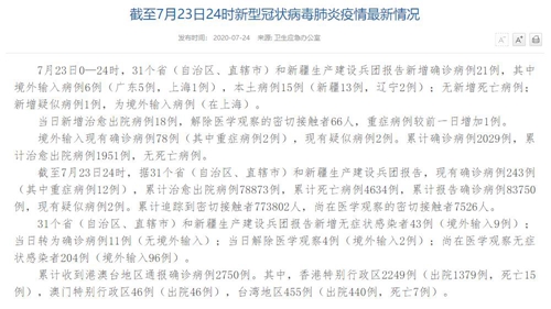情況表示,截至7月23日24時(shí),據(jù)31個(gè)?。ㄗ灾螀^(qū)、直轄市)和新疆生產(chǎn)建設(shè)兵團(tuán)報(bào)告,現(xiàn)有確診病例243例(其中重癥病例12例),累計(jì)治愈出院病例78873例,累計(jì)死亡病例4634例,累計(jì)報(bào)告確診病例83750例,現(xiàn)有疑似病例2例。累計(jì)追蹤到密切接觸者773802人,尚在醫(yī)學(xué)觀察的密切接觸者7526人。