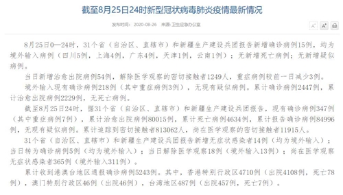 情況顯示,截至8月25日24時,據(jù)31個省(自治區(qū)、直轄市)和新疆生產(chǎn)建設(shè)兵團報告,現(xiàn)有確診病例347例(其中重癥病例7例),累計治愈出院病例80015例,累計死亡病例4634例,累計報告確診病例84996例,無現(xiàn)有疑似病例。累計追蹤到密切接觸者813062人,尚在醫(yī)學(xué)觀察的密切接觸者11915人。