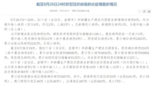 情況顯示,截至8月26日24時(shí),據(jù)31個(gè)?。ㄗ灾螀^(qū)、直轄市)和新疆生產(chǎn)建設(shè)兵團(tuán)報(bào)告,現(xiàn)有確診病例324例(其中重癥病例4例),累計(jì)治愈出院病例80046例,累計(jì)死亡病例4634例,累計(jì)報(bào)告確診病例85004例,現(xiàn)有疑似病例1例。累計(jì)追蹤到密切接觸者813571人,尚在醫(yī)學(xué)觀察的密切接觸者11227人。