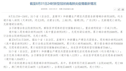 截至8月31日24時,據(jù)31個?。ㄗ灾螀^(qū)、直轄市)和新疆生產(chǎn)建設兵團報告,現(xiàn)有確診病例216例(其中重癥病例3例),累計治愈出院病例80208例,累計死亡病例4634例,累計報告確診病例85058例,無現(xiàn)有疑似病例。累計追蹤到密切接觸者815740人,尚在醫(yī)學觀察的密切接觸者7546人。