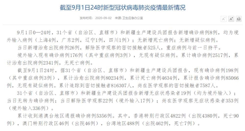 國家衛(wèi)健委:9月1日新增確診病例8例 均為境外輸入病例