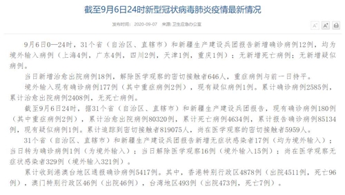 情況顯示,截至9月6日24時,據(jù)31個?。ㄗ灾螀^(qū)、直轄市)和新疆生產(chǎn)建設兵團報告,現(xiàn)有確診病例180例(其中重癥病例2例),累計治愈出院病例80320例,累計死亡病例4634例,累計報告確診病例85134例,現(xiàn)有疑似病例1例。累計追蹤到密切接觸者819075人,尚在醫(yī)學觀察的密切接觸者5959人。