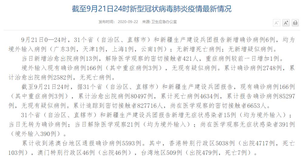 情況顯示,截至9月21日24時(shí),據(jù)31個(gè)省(自治區(qū)、直轄市)和新疆生產(chǎn)建設(shè)兵團(tuán)報(bào)告,現(xiàn)有確診病例166例(其中重癥病例3例),累計(jì)治愈出院病例80497例,累計(jì)死亡病例4634例,累計(jì)報(bào)告確診病例85297例,無(wú)現(xiàn)有疑似病例。累計(jì)追蹤到密切接觸者827716人,尚在醫(yī)學(xué)觀察的密切接觸者6653人。