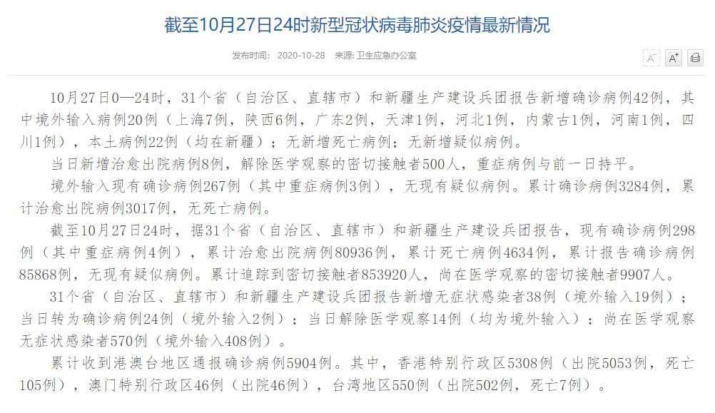 | 國(guó)家衛(wèi)健委:10月27日新增確診病例42例 其中本土病例22例均在新疆 |