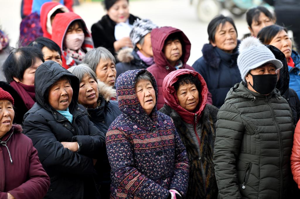 ↑1月3日,在山西省渾源縣荊莊村,村民們?cè)谛蕾p渾源縣貧困山區(qū)合唱團(tuán)的演出。