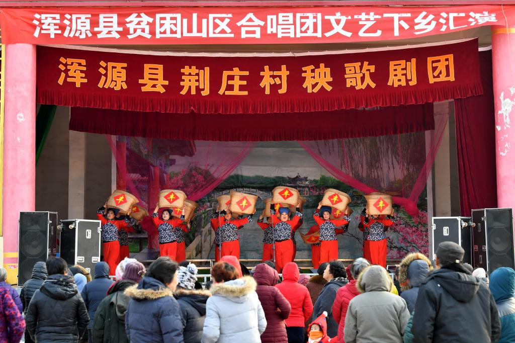 ↑1月3日,在山西省渾源縣荊莊村,渾源縣貧困山區(qū)合唱團(tuán)在表演歌舞《看山看水看中國》。