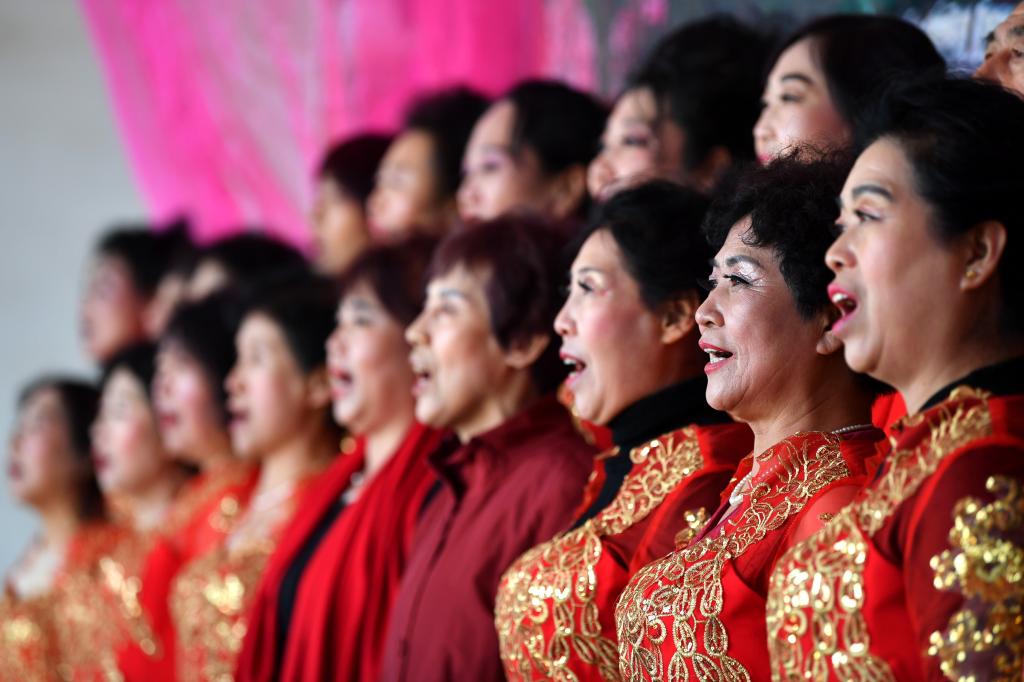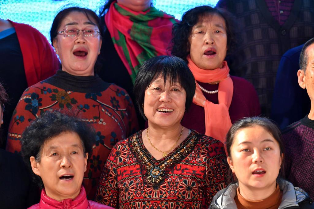 ↑1月3日,在山西省渾源縣荊莊村,渾源縣貧困山區(qū)合唱團(tuán)在表演大合唱《祝福祖國》。