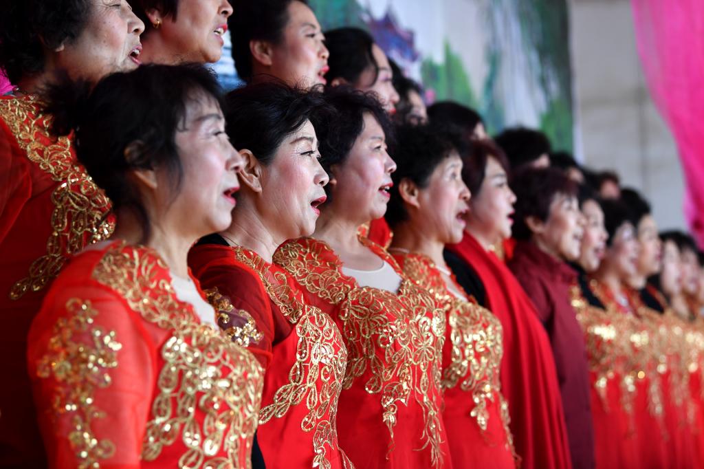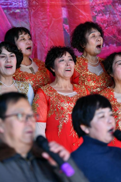 ↑1月3日,在山西省渾源縣荊莊村,渾源縣貧困山區(qū)合唱團(tuán)在表演合唱《紅梅贊》。