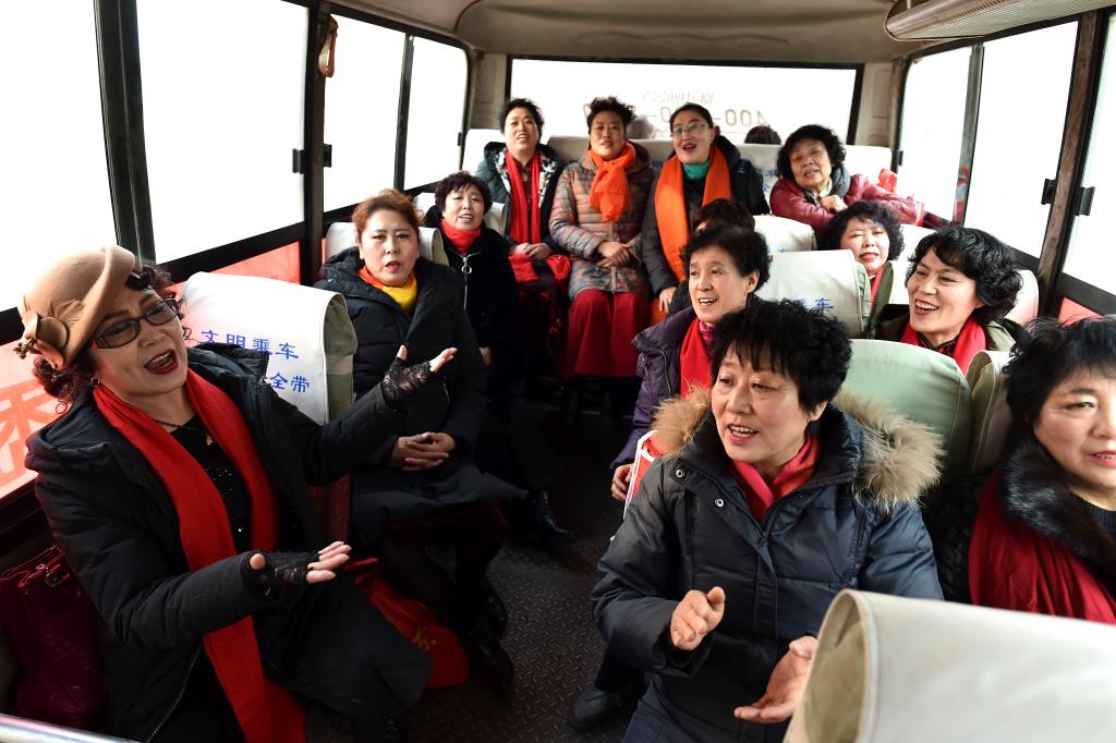↑1月3日,渾源縣貧困山區(qū)合唱團(tuán)團(tuán)員們?cè)谇巴G莊村的大巴車上排練。