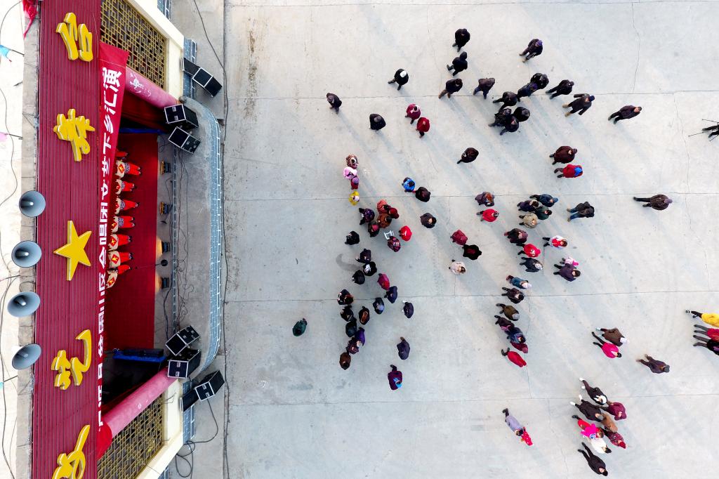 ↑1月3日,在山西省渾源縣荊莊村,村民們?cè)谛蕾p渾源縣貧困山區(qū)合唱團(tuán)的演出(無人機(jī)拍攝)。