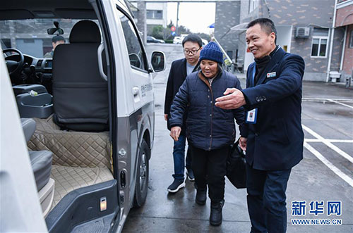 李耀進(jìn)(右)在杭州市救助管理站送一名需要被救助的老人去車(chē)站乘車(chē)回家(2018年12月27日)。 新華社記者 徐昱 攝