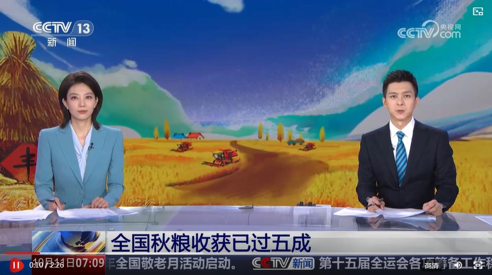 央視網消息:據農業(yè)農村部最新消息,截至10月10日,全國秋糧收獲已過五成。分作物看,中稻收獲近六成,玉米過五成,大豆五成半,雙季晚稻零星收獲。
