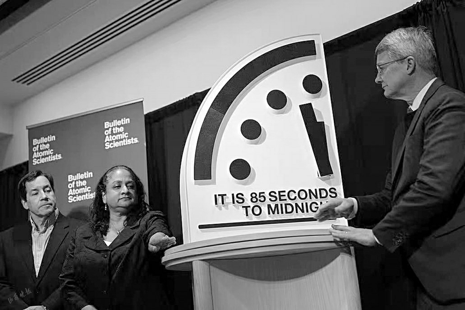 1947年設立之初,“末日之鐘”的指針設在23時53分的位置,此后多次調整。1991年冷戰(zhàn)結束后,“末日之鐘”的指針回撥至23時43分,為設立以來距離午夜最遠的一次。上一次調整是2025年1月,當時被設定為距離午夜89秒。